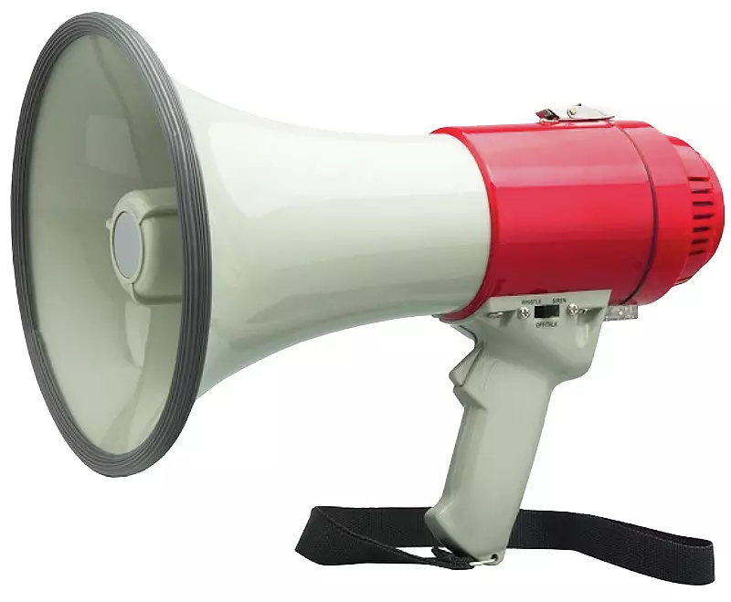 This powerful 30 watt handheld megaphone is ideal for outdoor use with a range of up to 1000 metres. In urban areas its sound reaches approximately 350 metres. The lightweight and ergonomic design makes it easy to carry and use for long periods. It is powered by six 1.5V C batteries (LR14), which are not included. When fully charged, the megaphone will provide up to 8 hours of operation, enough for almost a full day at events or in emergency situations.