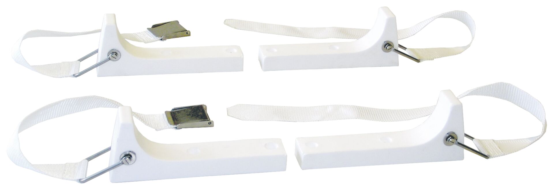 Pelastuslautanteline. Muovia, sakkelit ja hihnan soljet ruostumatonta terästä. Säädettävissä erikokoisille kovapakkauksille.