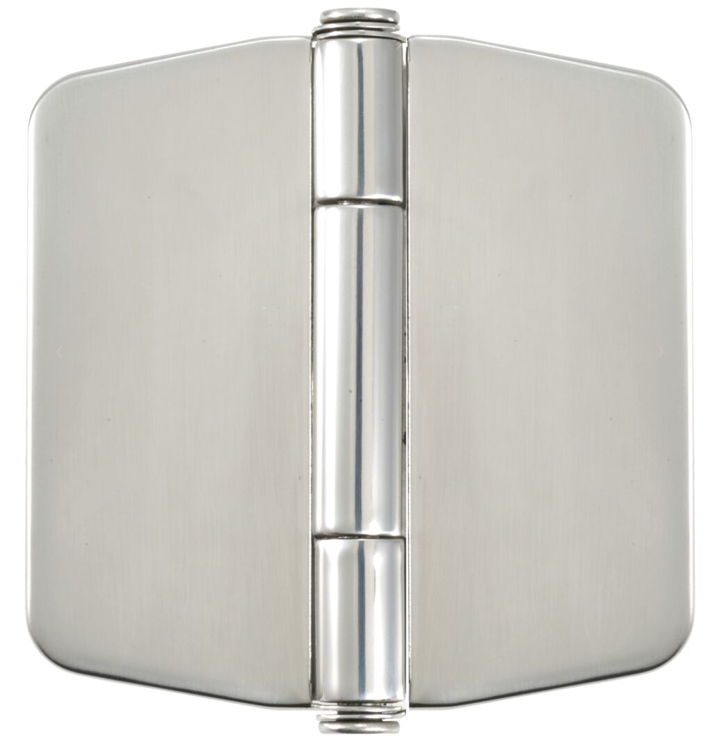 • Modern shape and simplified two seam barrel design.<br />• The unique patented covers are built into the pivot for permanent use and concealing the screws.<br />• Push cover to snap in place. Can be unsnapped by using a small flat-head screwdriver.<br />• Fits different countersink screw types.<br />• Silicon caulking on cover is required for specific application use.<br />• Passes 500 hours salt-spray test.<br />• If this hinge is mounted in the pocket, make sure to have enough room around the hinge leaves to allow the covers to be snapped down.<br />• 78 x 78mm, 3-1/16' X 3-1/16'<br />