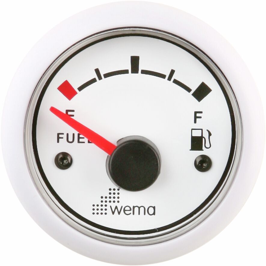 Polttoainemittari S3/S5-antureille, 240-30 ?. Asennus-Ø 52 mm, asennussyvyys 62 mm, kokonais-Ø 62 mm. Vakiona punainen ja keltainen valaistus. Käyttöjännite 12/24 V. Valkoinen pohja, valkoinen kehys.