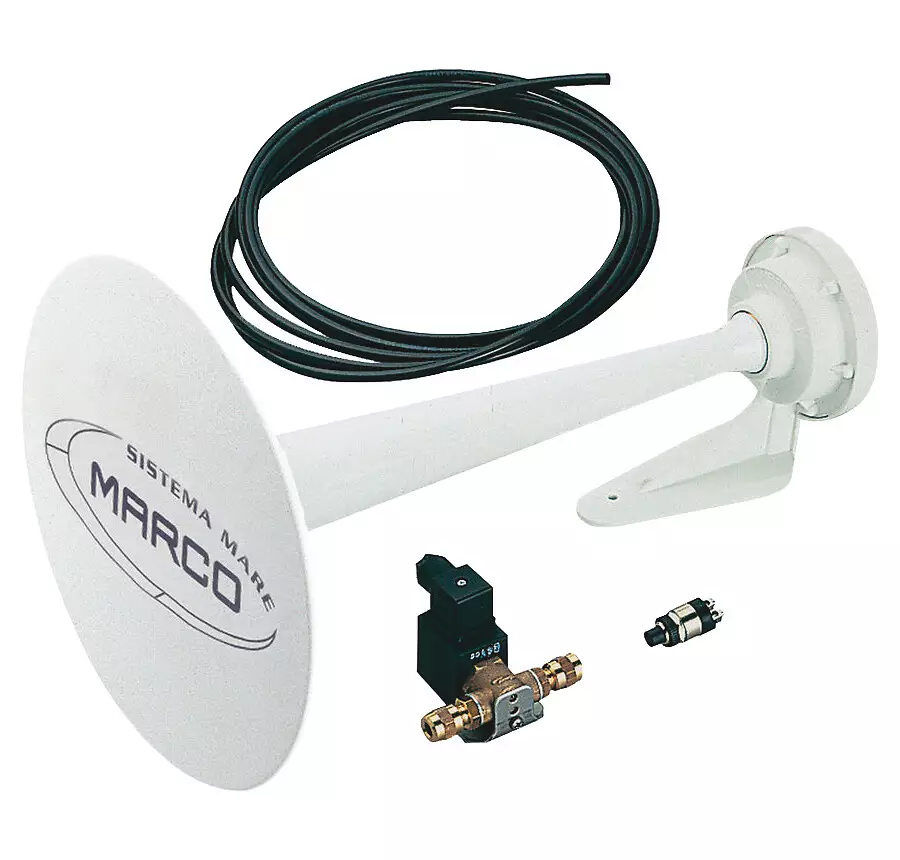 Marco äänitorvi, jossa on valkoinen Ø 300 mm torvi. Sähköventtiili ja asennustarvikkeet, paineilmakäyttöön 6/12 bar. Täyttää COLREG 1972 IMO:n luokan III määräykset. Hyväksynnät: RINA, LLOYD'S REGISTER MCA, BUREAU VERITAS, BSH ja NMMA. Torven materiaali messinkiä, muovinen kiinnitysalusta.