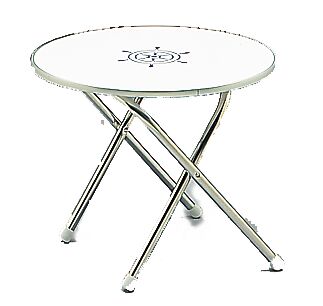 Pyöreässä kansipöydässä valkoinen melamiinipinta, alumiinilista kiertää pöydän reunaa. Kokoontaitettava. Levynpaksuus 16 mm, pöydän korkeus 49 cm ja halkaisija 61 cm.