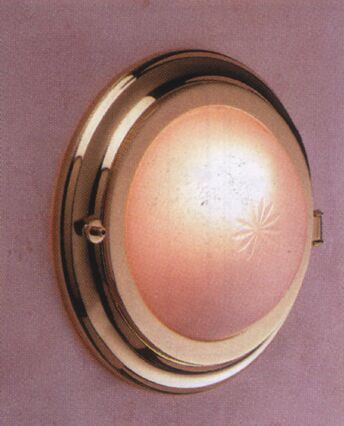 Pyöreä seinävalaisin kiillotettua messinkiä ja hiekkapuhallettua lasia. Halkaisija 260 mm.