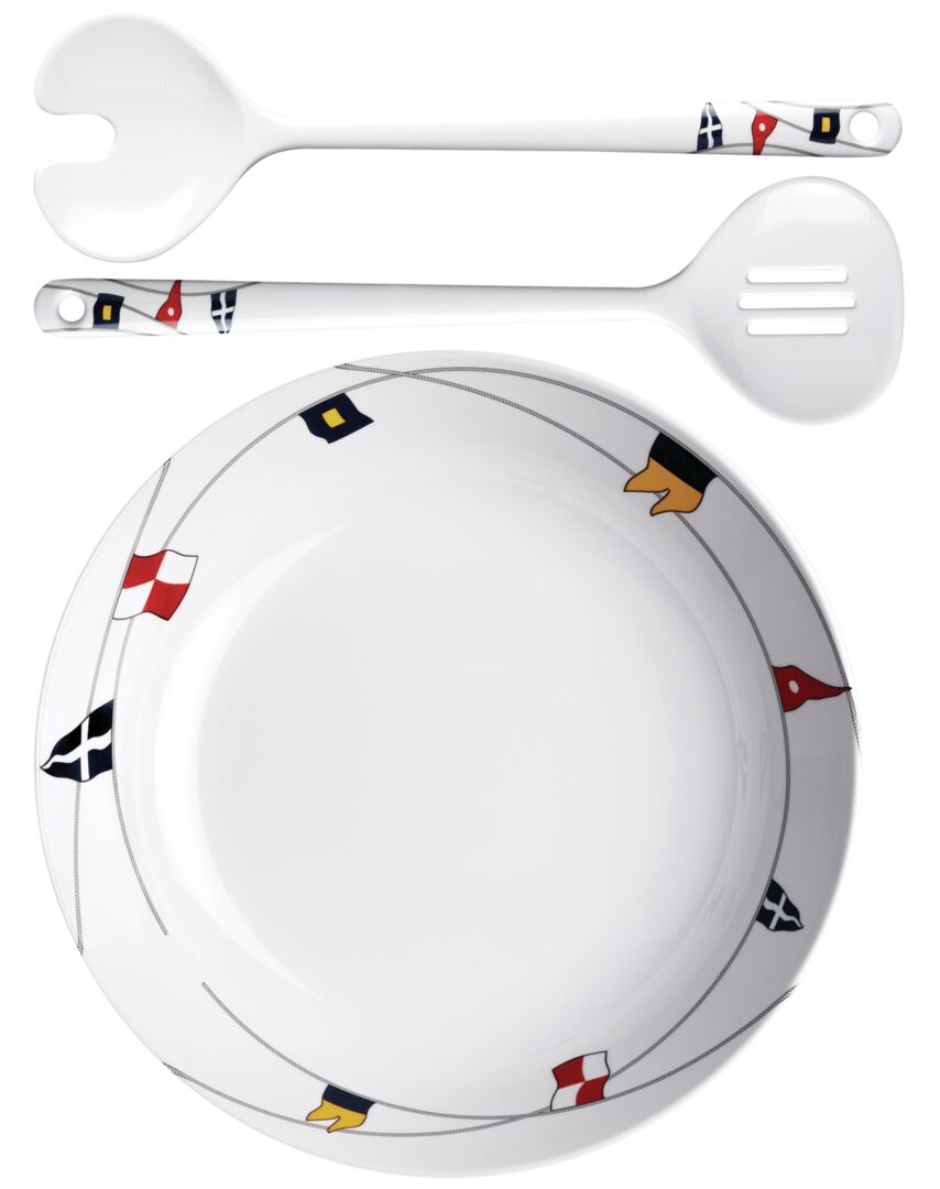 Särkymätön salaattikulho veneisiin, halkaisija 25 cm, melamiini, BPA vapaa. Melamiinista valmistetussa REGATA-salaattikulhossa on, kuten muissakin sarjan tuotteissa, värikäs, kattausta koristava lippumalli. Salaattikulhoon sisältyy kaksi melamiinitarjoiluvälinettä. Täydennä merihenkiset ruokailuvälineet tällä ja muilla saman sarjan värikkäillä tuotteilla!