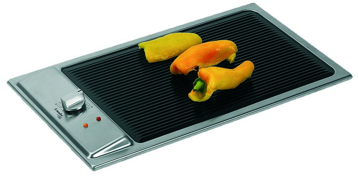 Uppoasennettava grillilevy. Pituus 500 mm, korkeus 40 mm, syvyys 300 mm, paino 7 kg, teho 2400W 220 V.