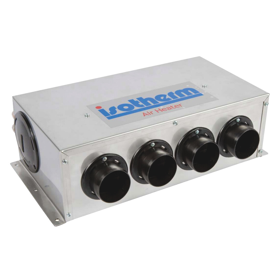 • Neljä Ø 60 mm:n poistoaukkoa<br />• Ilmanotto voidaan kanavoida letkuadaptereilla<br />• Puhaltimen nopeuden säätö<br />• 24V<br />• Ruostumaton teräskotelo<br />• Korkea lämmöntuotto 10 kW<br />• Korkeaa lämpötilaa kestävät osat