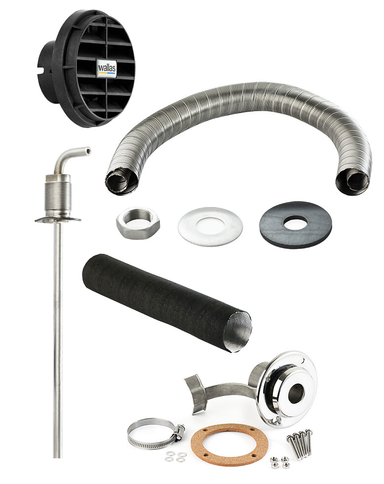 Veneasennussarja Spartan sisältää: 2m savukaasuletku 28/45 mm 1 kpl runkoläpivienti 1 kpl liitäntäsarja kiinteään tankkiin 10m lämminilmaletku 75mm 3 kpl ulospuhallusritilä 75mm