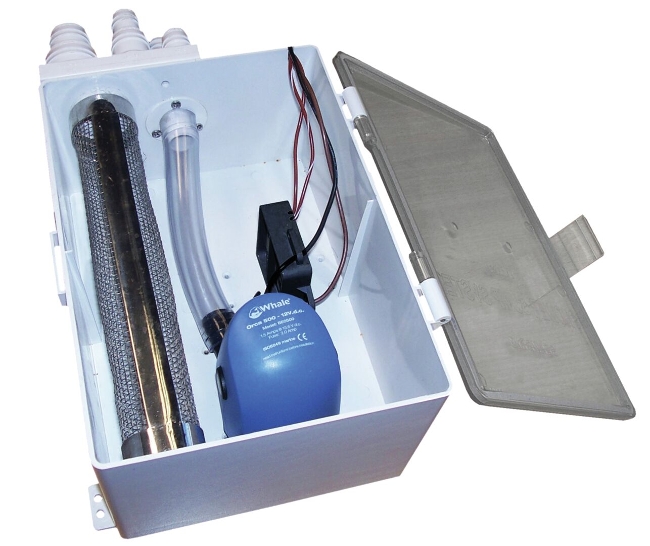 Whale-suihkukaivoallas. Kirkas saranoitu kansi ja helposti irrotettava ruostumaton sihti helpottavat kaivon tarkistus- ja huoltotoimenpiteitä. Vedenpinnan valvonnasta vastaa Whalen oma elektroninen pinnanvalvonta-anturi ja tyhjennyksen hoitaa luotettava Orca 500 -pumppu. Sisäänrakennettu takaiskuventtiili estää tyhjennettävän veden valumisen takaisin säiliöön. Säiliön päädyssä on kolmelle tuloletkulle tulpatut liittimet: 1 x 32/28, 1 x 25/19 ja 1 x 19 mm letkuille. Poistoletku 19/25 mm.