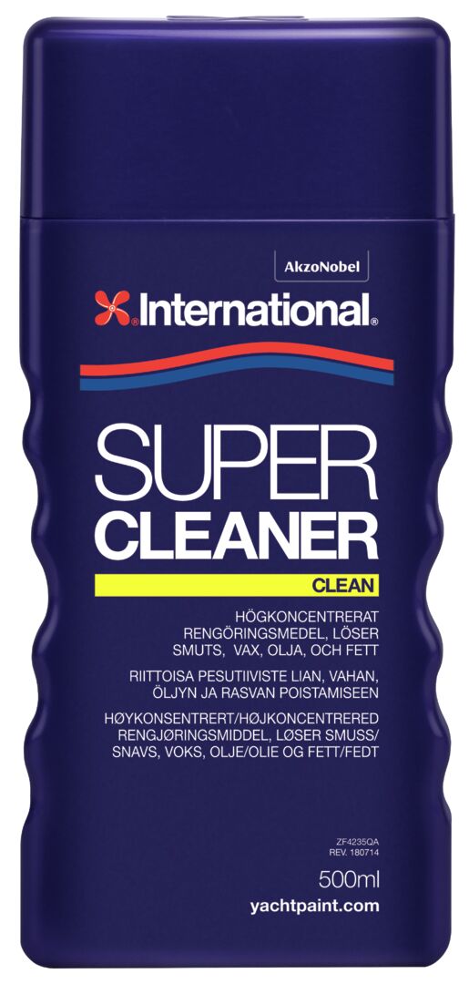 TUOTEKUVAUS<br />Super Cleaner on erittäin tehokas puhdistusainetiiviste. Poistaa tehokkaasti vahan, öljyn ja lian. Sopii käsin- ja painepesuun. Poistaa rasvan ja puhdistaa gelcoatia<br />ja maalipintaa vahingoittamatta. Käytetään aina ennen vahausta. <br />* Erittäin tehokas rasvanpoisto runsaammin annosteltuna <br />* Helppokäyttöinen <br />* Ei vaihingoita akryylilasia<br />* Käytetään ennen maalausta ja vahausta <br />* Sopii myös veneen, pilssin/moottorin tai auton yleispuhdistusaineeksi <br />* Biohajoava. <br /><br />KÄYTTÖOHJE<br />Esikäsittely:<br />Huuhtele makealla vedellä ja anna kuivua. <br /><br />Menetelmä:<br />Valitse sopiva sekoitussuhde. Lisää makeaan veteen tarvittavan monta korkillista Super Cleaner -tuotetta. Kaada Super Cleaner kosteaan rättiin tai sieneen ja pyyhi koko pinta puhtaaksi kevyesti painamalla. Huuhtele makealla vedellä. <br /><br />Vihjeitä:<br />Sekoitus - Ravistettava ennen käyttöä. <br /><br />Tärkeitä tietoja:<br />Tuotteen lämpötilan on oltava vähintään 5 °C ja enintään 35 °C.<br />Ympäristön lämpötilan on oltava vähintään 5 °C ja enintään 35 °C.<br />Alustan lämpötilan on oltava vähintään 5 °C ja enintään 35 °C.<br /><br />Yhteensopivuus/alustat:<br />Sopii gelcoatille, maali- ja metallipinnoille.<br /><br />Levitysmenetelmät:<br />Sivellin, rätti, sieni.