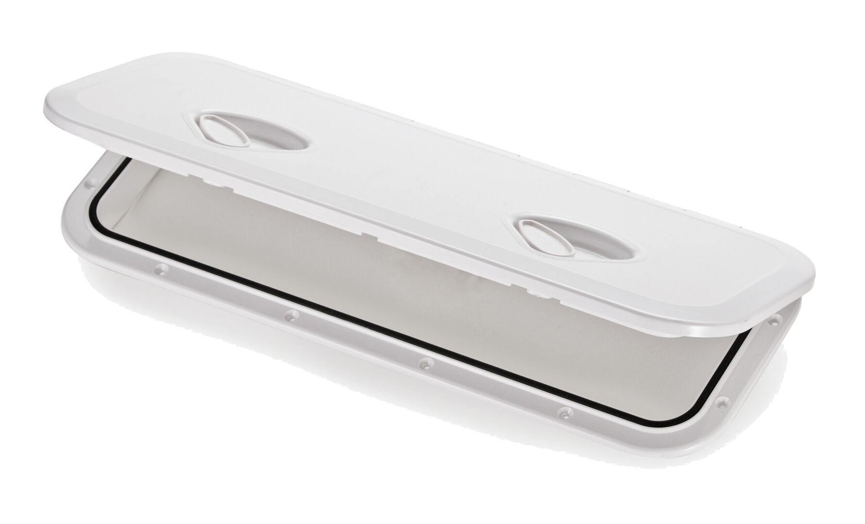 Trem-huoltoluukku kumitiivisteellä. Väri: valkoinen RAL9003. Sisämitta: 162 mm x 521 mm Ulkomitta: 243 mm x 607 mm Asennusmitta: 173 x 530 mm