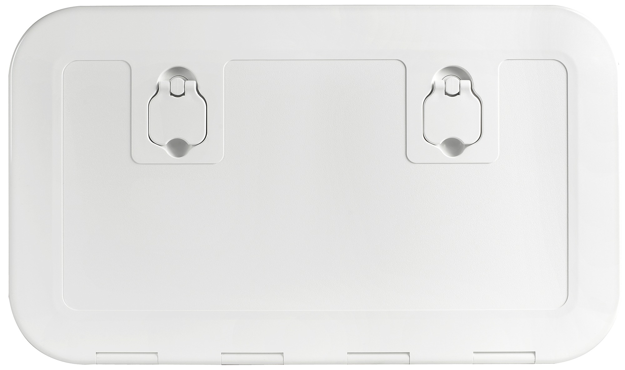 The faired cover hides the frame completely; flush hinges; 180° opening; walking surface. UV BASF resistant. Outside: 600x350mm Inside: 513x265mm Cut: 530x280mm