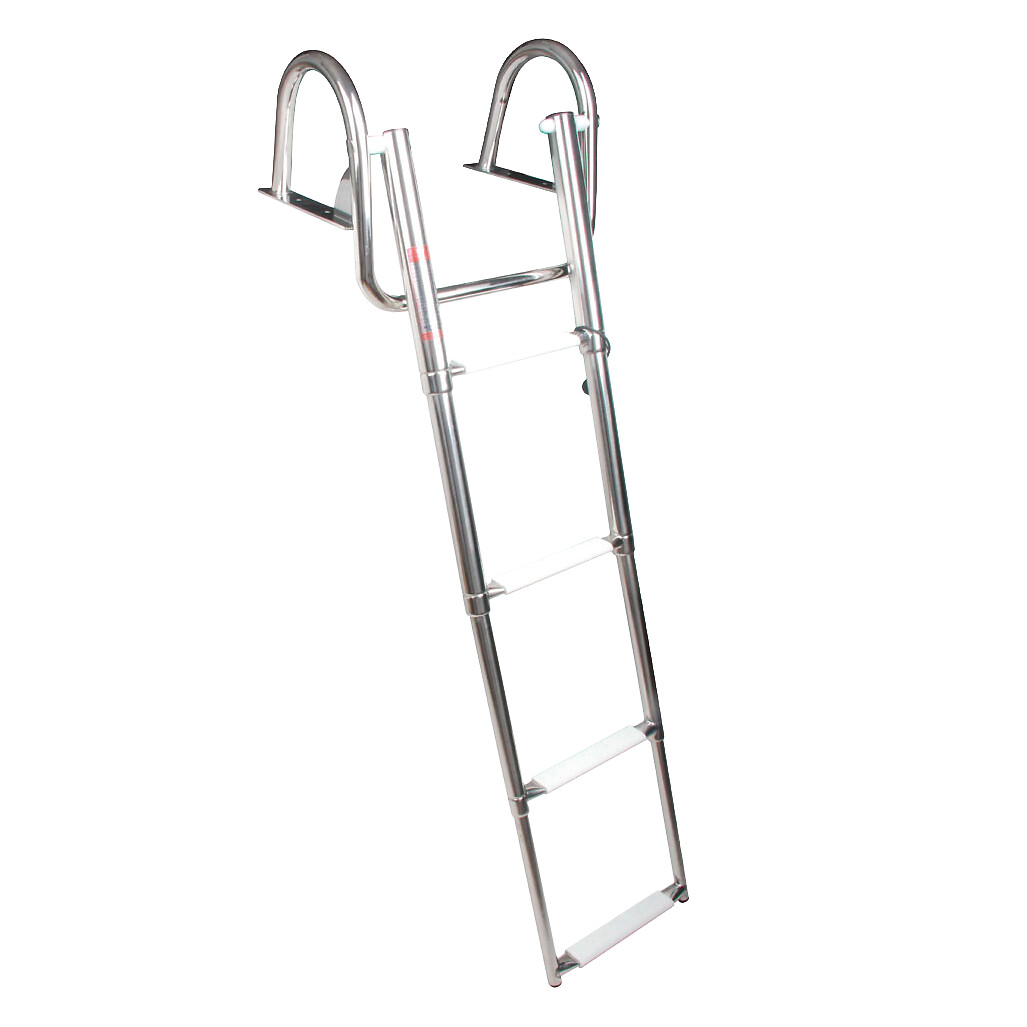 Teleskooppitikkaat kahvoilla. Valmistettu peilikiillotetusta ruostumattomasta teräksestä (AISI316). Ovaalinmuotoiset askelmat ja valkoinen muovinen astinlauta.