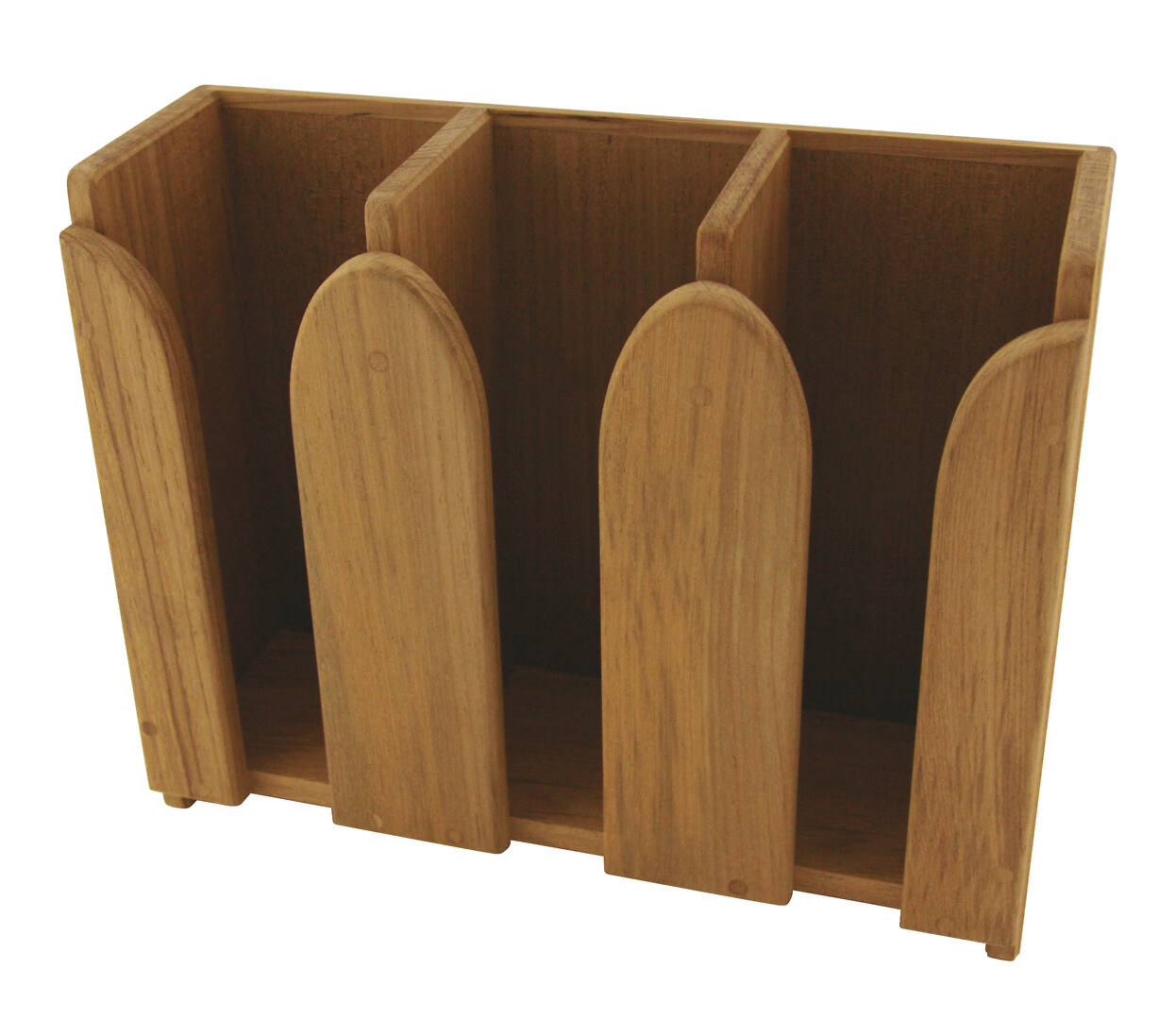 Tiikkisessä mukitelineessä kolme lokeroa, koko 320 x 110 x 250 mm.