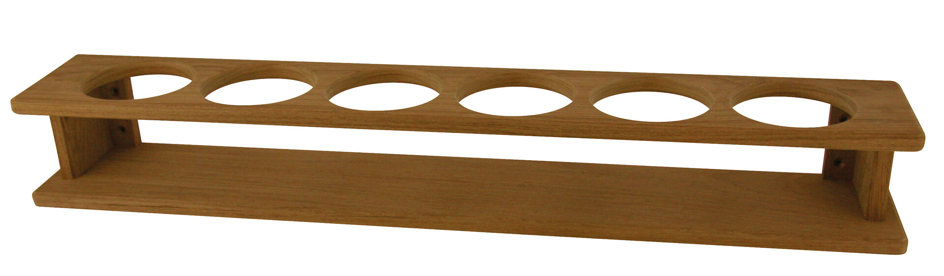Tiikkinen teline kuudelle lasille, koko 610 x 90 x 90 mm. Lasin halkaisija 7 cm.