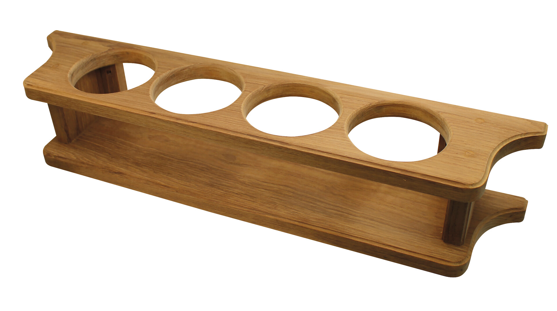 Tiikkinen teline neljälle lasille, koko 430 x 90 x 90 mm. Lasin halkaisija 7 cm.