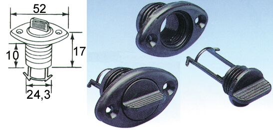 Tyhjennystulppa mustaa muovia, kumitiiviste. Kiinnitys tapahtuu kahdella ruuvilla. Reikäväli 40 mm, sisähalkaisija 16 mm, ulkohalkaisija 24,5 mm.