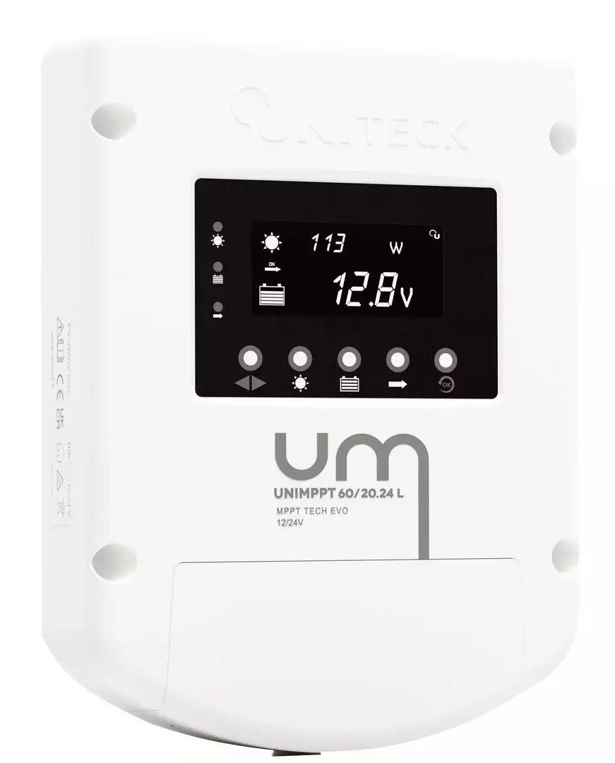 UNIMPPT lataussäädin muuntaa kaiken aurinkopaneelista saatavan sähköenergian akun latausvirraksi. Sen ainutlaatuinen ALGOTECK 6 -latauskäyrä testaa akun kunnon, lataa sen täyteen, poistaa sulfaatin, ehkäisee kerrostumista, ylläpitää varaustasoa ja pidentää akun käyttöikää. Lisäksi se huomioi akun teknologian ja ympäristön lämpötilan, säätäen jännitetasot valmistajan suositusten mukaisesti. MPPT-teknologia hyödyntää koko aurinkopaneelin jännitteen, muuntaen ylimääräisen paneelin/akun jännitteen latausvirraksi, jota perinteinen lataussäädin ei käyttäisi. Optimoitu MPPT-ohjelmisto, yhdistettynä yhteen markkinoiden nopeimmista mikroprosessoreista, etsii reaaliaikaisesti (100 ms välein) paneelin maksimitehopistettä. Tämä takaa jopa 40 % enemmän energiaa talvella ja 15 % enemmän kesällä verrattuna PWM-lataussäätimeen – myös vaihtelevissa sääolosuhteissa. UNIMPPT lataussäädin on varustettu käyttäjäystävällisellä LCD-näytöllä, joka mahdollistaa tarkan seurannan aurinkosähköjärjestelmästäsi: aurinkopaneelin tuotanto, akun varaustila ja 12/24V-ulostulon sähkönkulutus. Ajastintoiminnon avulla voit myös ohjelmoida sähkölaitteiden käyttöä.
