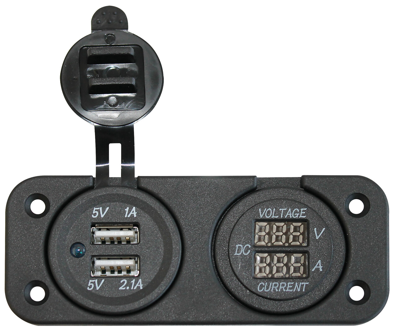 Digitaalinen volttimittari/USB-latauspaneeli. USB-laturi kahdella ulostulolla (A) sekä jännitemittari.