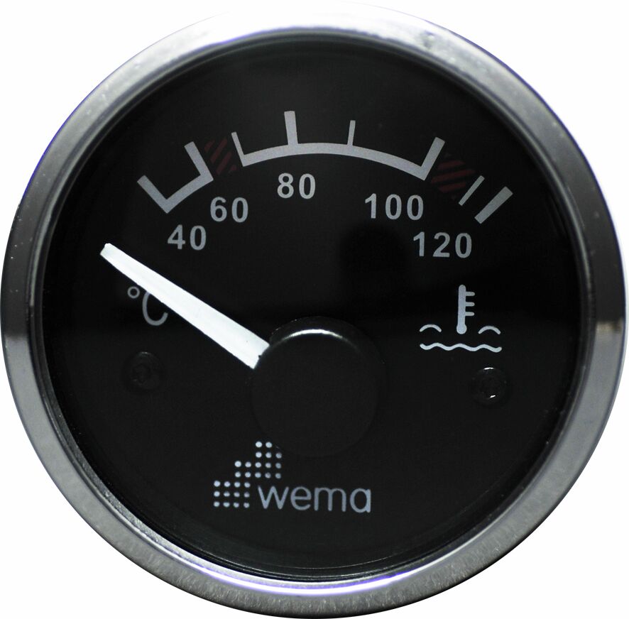 Lämpötilamittarit, 450-23 ?. Asennus-Ø 52 mm, asennussyvyys 62 mm, kokonais-Ø 62 mm. Vakiona punainen ja keltainen valaistus. 24 V asennusvalmius etuvastuksella. Käyttöjännite 12/24 V. Musta pohja, kehys ruostumatonta terästä.
