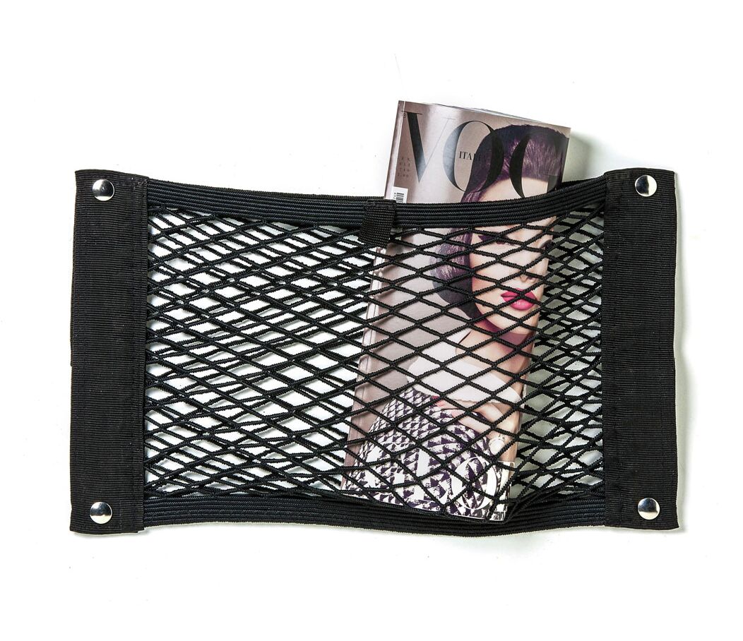 Joustava verkkotasku, jossa mustat tukevat reunanauhat. Kiinnitys seinään ruuvattavilla neljällä nepparilla.