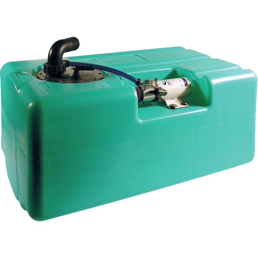 Muovinen vesitankki, sisältäen painevesipumpun ja liittimet. Pumppu UP2E, 12/24 V, 3/8” liittimet, täyttöliitin Ø 38 mm. Virtausnopeus 10l /min.