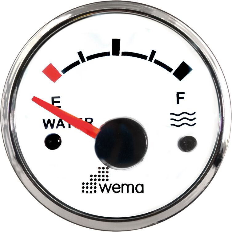 Vesitankkimittari S3/S5-antureille, 0-190 ?. Asennus-Ø 52 mm, asennus syvyys 62 mm, kokonais-Ø 62 mm. Vakiona punainen ja keltainen valaistus. Käyttöjännite 12/24 V. Valkoinen pohja, kehys ruostumatonta terästä.