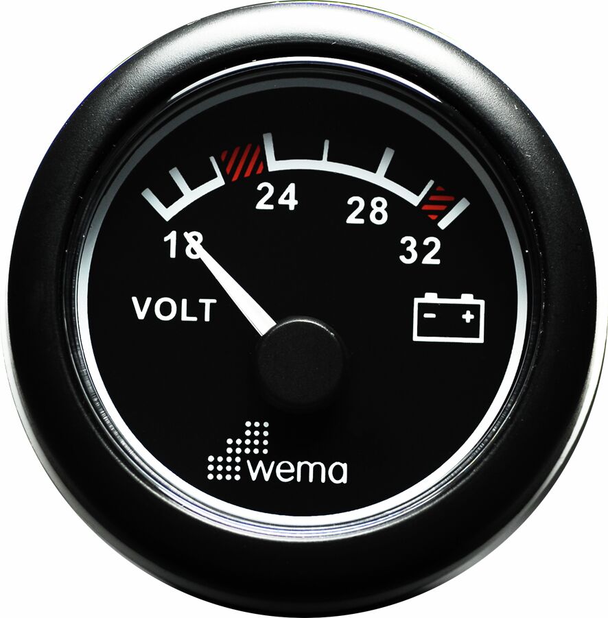 Analoginen volttimittari 24V. Asennus-Ø 52 mm, asennussyvyys 55 mm, kokonais-Ø 62 mm. Vakiona punainen ja keltainen valaistus. Musta pohja / musta kehys.