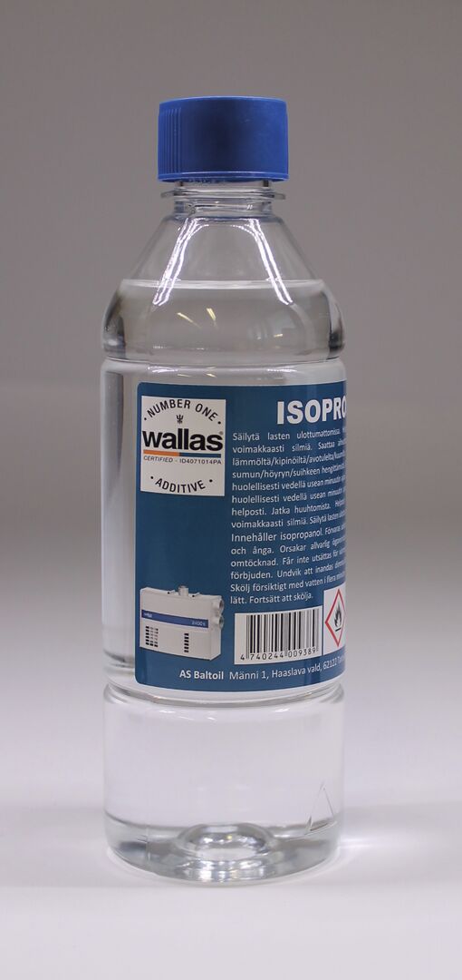 Wallas Isopropanol valopetroli- ja diesel-lämmittimiin polttoainelinjan puhdistukseen ja kausisäilytykseen. Sisältää tavalliseen isopropanoliin verrattuna voitelevia entsyymejä, jolloin se ei vain puhdista polttoainelinjaa ja pumppua vaan voitelee niitä lisäten tuotteen elinikää ja toimintavarmuutta. Sekoitussuhde 4 %.